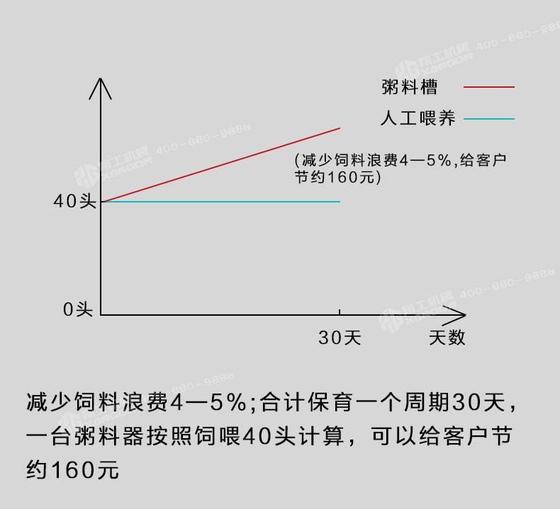 即便按照三個好處累加保育一次可以節約560元,一年按照使用粥料器保育6—8窩仔豬,累加一臺粥料器智能豬料槽通過在豬場的試驗得出驗證,解決了飼料轉化率,豬通過食料相比之前的飼喂每天多增重0.4斤,減少和杜絕了胃腸道病的發生幾率。合理采食的同時減少了飼料的浪費,省料即是省錢,普通的飼喂飼料浪費率在5%-10%,豬場中使用了粥料器后飼料浪費率控制在2%左右。減少人員的勞動強度,夜晚無法定量投喂的問題。